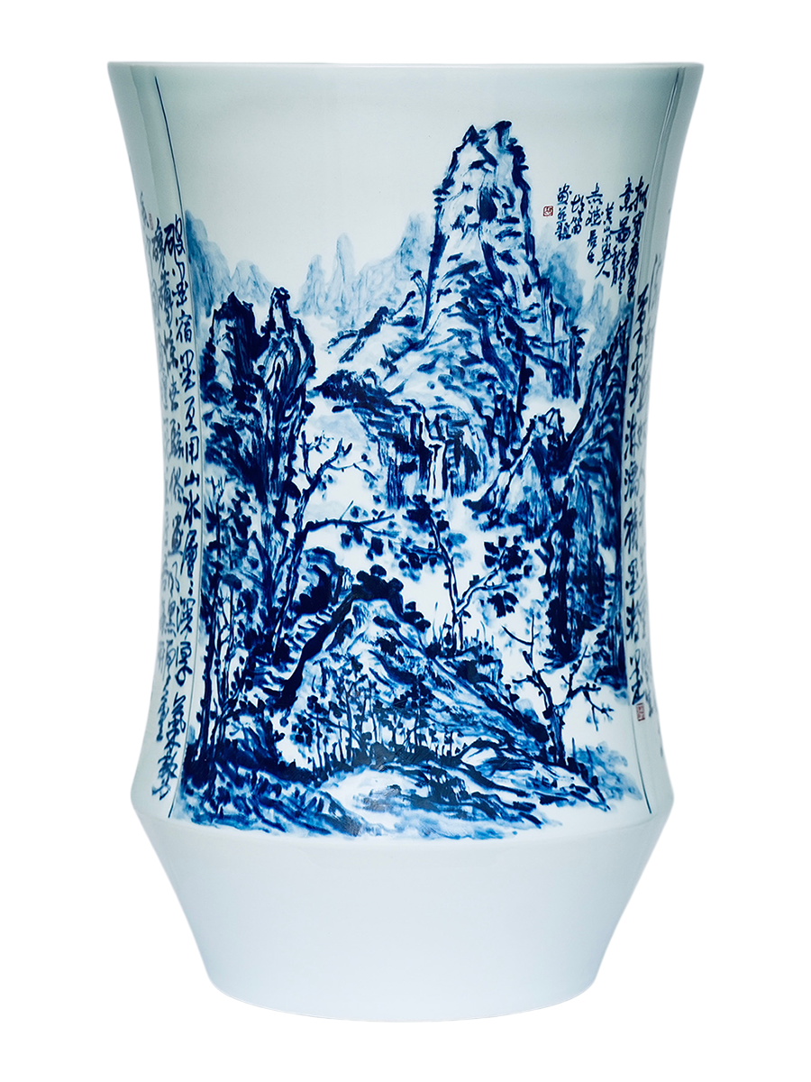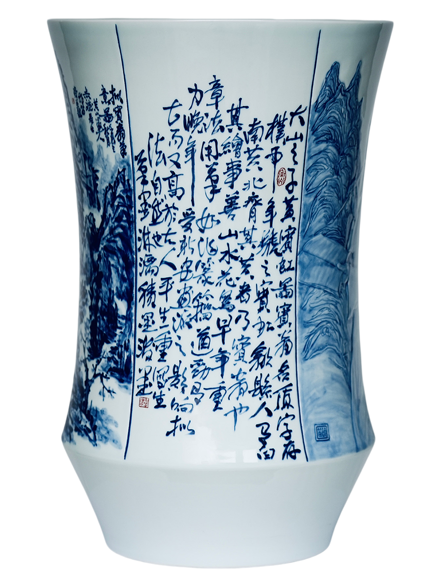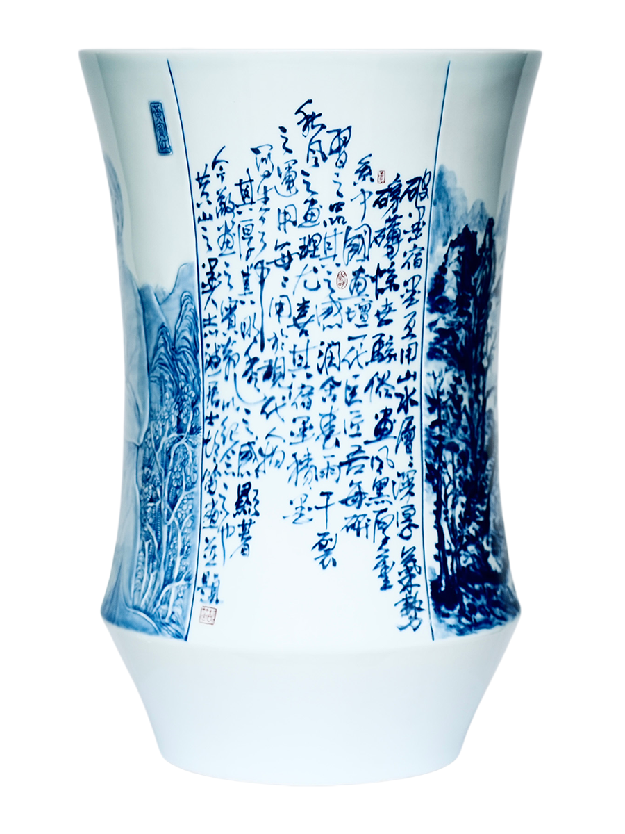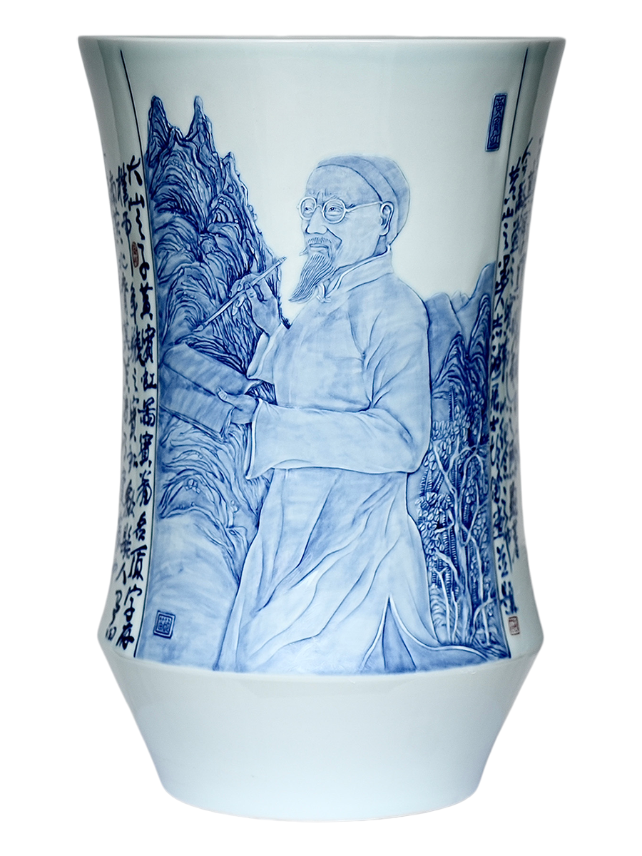 创作说明: 以书法、篆刻、绘画、雕刻为表达方式,人物刻画为雕刻形式,如铜板雕刻,佐以青花料渲染,其人物、绘画、书法、篆刻、雕刻等形成通景,跌宕起伏,韵律清新。 创作素材: 黄宾虹为近代山水画宗师,创“黑密厚重”的浑厚华滋风格,精研积墨、宿墨法,升华传统笔墨为金石气象,著《画法要旨》立现代山水理论根基。