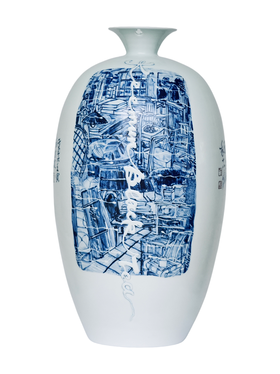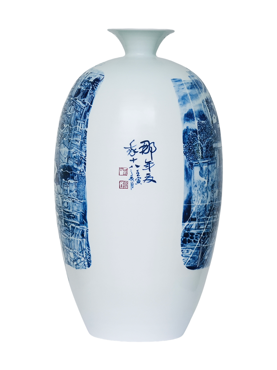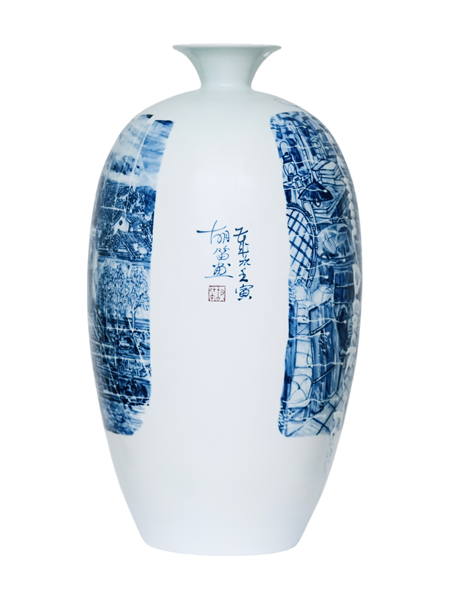 创作说明: 葫芦瓶造型,用原始水墨脸谱刻画,蓝印花布为装饰,以雕刻、剔雕相结合等来表达主题,充满无限想象 创作素材: 目连戏:中国最古老戏曲剧种,以佛经”目连救母"故事核心,融儒释道思想,穿插杂技百戏,被誉为"戏祖