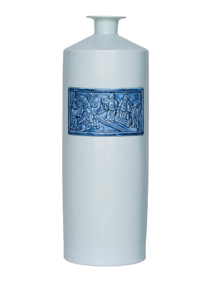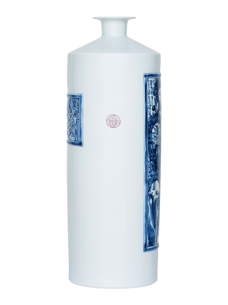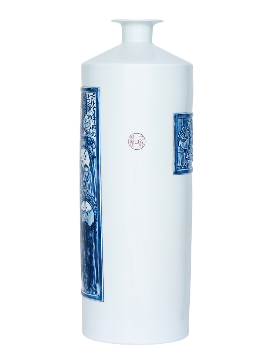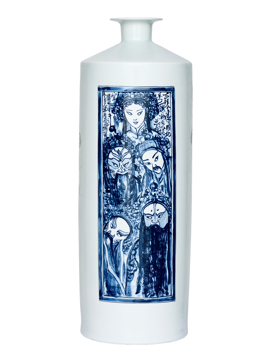 葫芦瓶造型,用原始水墨脸谱刻画,蓝印花布为装饰,以雕刻、剔雕相结合等来表达主题,充满无限想象