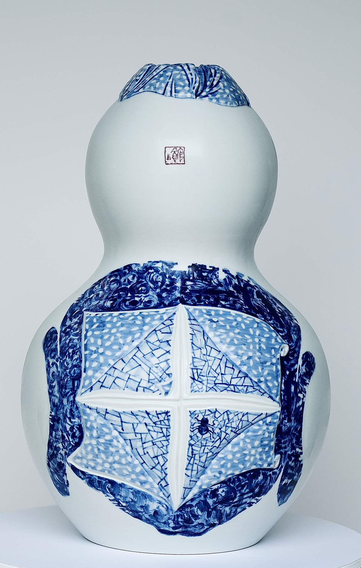 创作说明: 葫芦瓶造型,用原始水墨脸谱刻画,蓝印花布为装饰,以雕刻、剔雕相结合等来表达主题,充满无限想象 创作素材: 目连戏:中国最古老戏曲剧种,以佛经”目连救母"故事核心,融儒释道思想,穿插杂技百戏,被誉为"戏祖